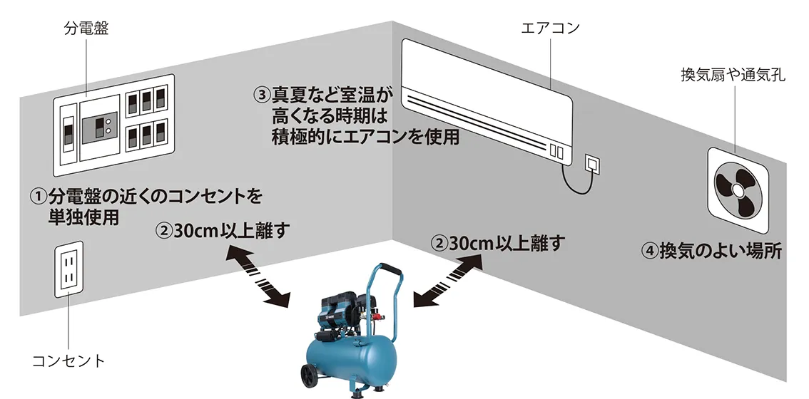 エアコンプレッサー設置場所についての製品に係る安全事項