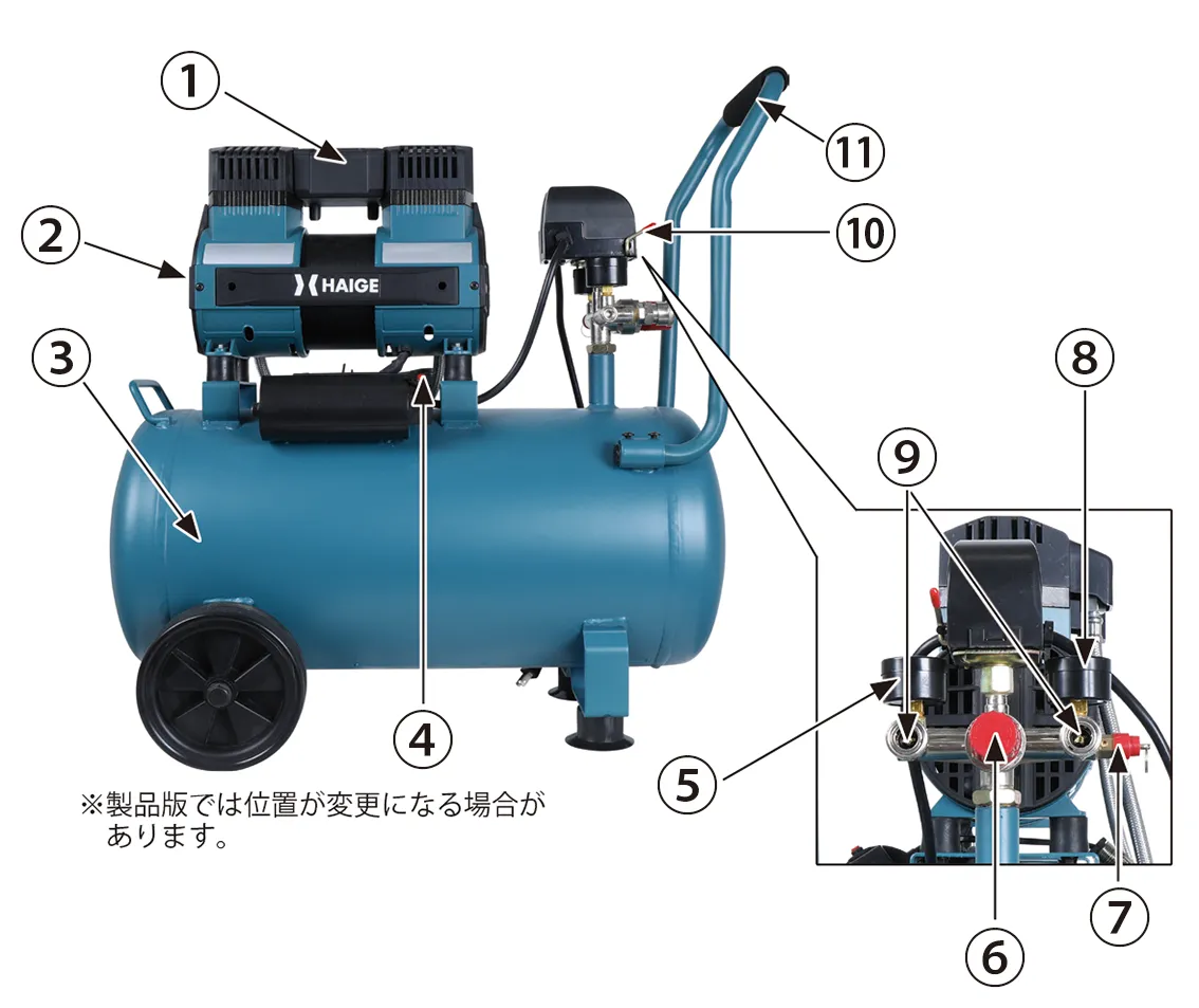 • 圧縮空気に水分が混入する場合があります。塗装作業を行う場合は、ウォーターセパレーターを取付けてください。