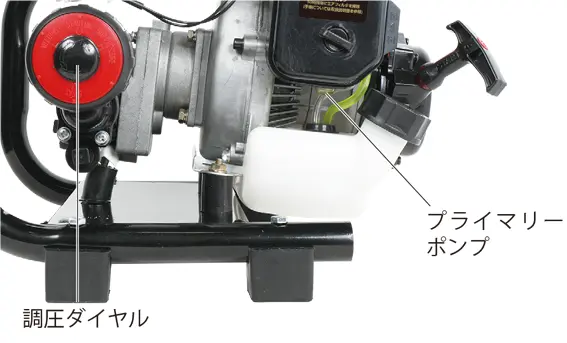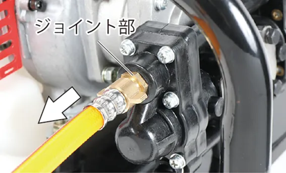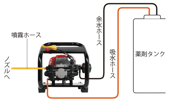 • 使用後は清水を吸水しポンプを数分間(2~3分)運転し、ポンプ、ホース、ノズル等の内部に残っている薬剤をきれいに流してください。