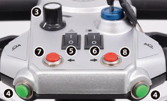 • 運転は「低速」で前進、後進、左右折S字走行、方向転換、回転走行をしっかりと練習し、操作に慣れてください。