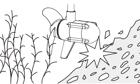 • プロペラに障害物がぶつからないよう、操作には十分注意してください。水中にある木、岩などの障害物に衝突したり、藻や釣り糸を巻き込んだりしないようにしてください。