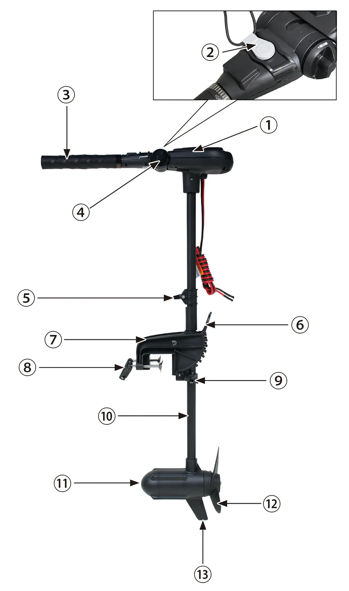 • このエレクトリックトローリングモーターは、釣りをする際の静かなボートコントロールでの使用を想定しています。メイン動力として長時間・最大出力で使用した航行は想定しておりません。大きな出力での連続使用は故障の原因になりますので、おやめください。大きな出力で使用する場合は、10分を目途とし、使用後は10分使用を休止してください。