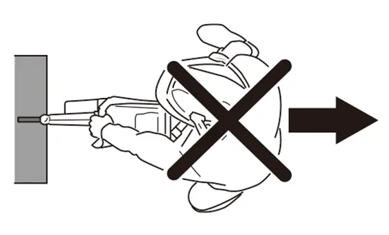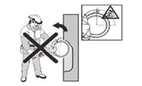 • 使用時は本製品を両手でしっかりと保持し、キックバックに耐えるよう腕を備えてください。また、切断線と一直線にならないように身体を左右どちらかによけて位置してください。